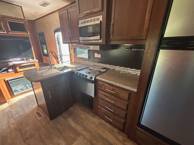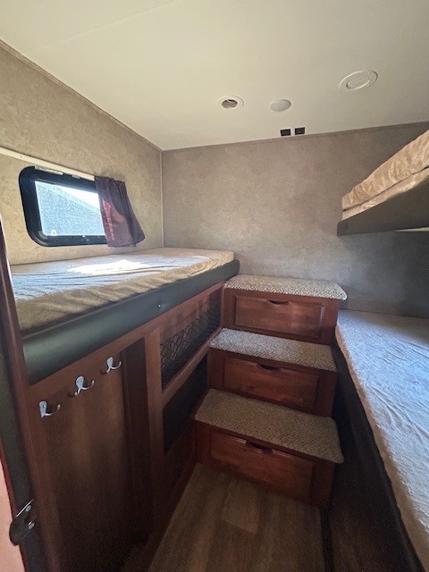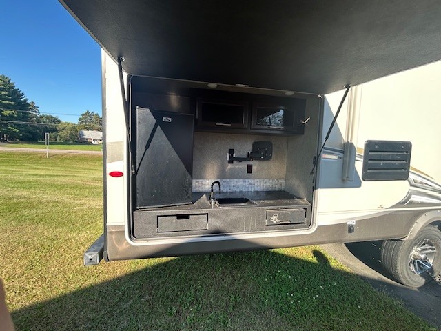 Features: 14 Ft. Electric slide out, Rear bunkhouse, Front Bedroom, Central Air Conditioning, Microwave, Gas Cook top, Awning, Fireplace, Outside Kitchen.